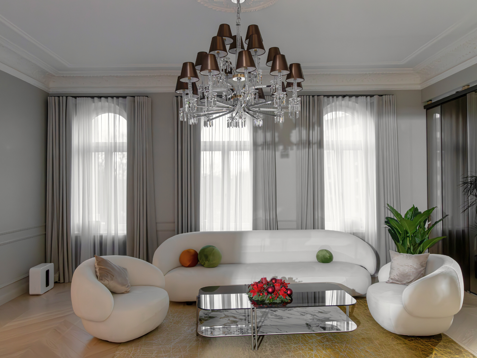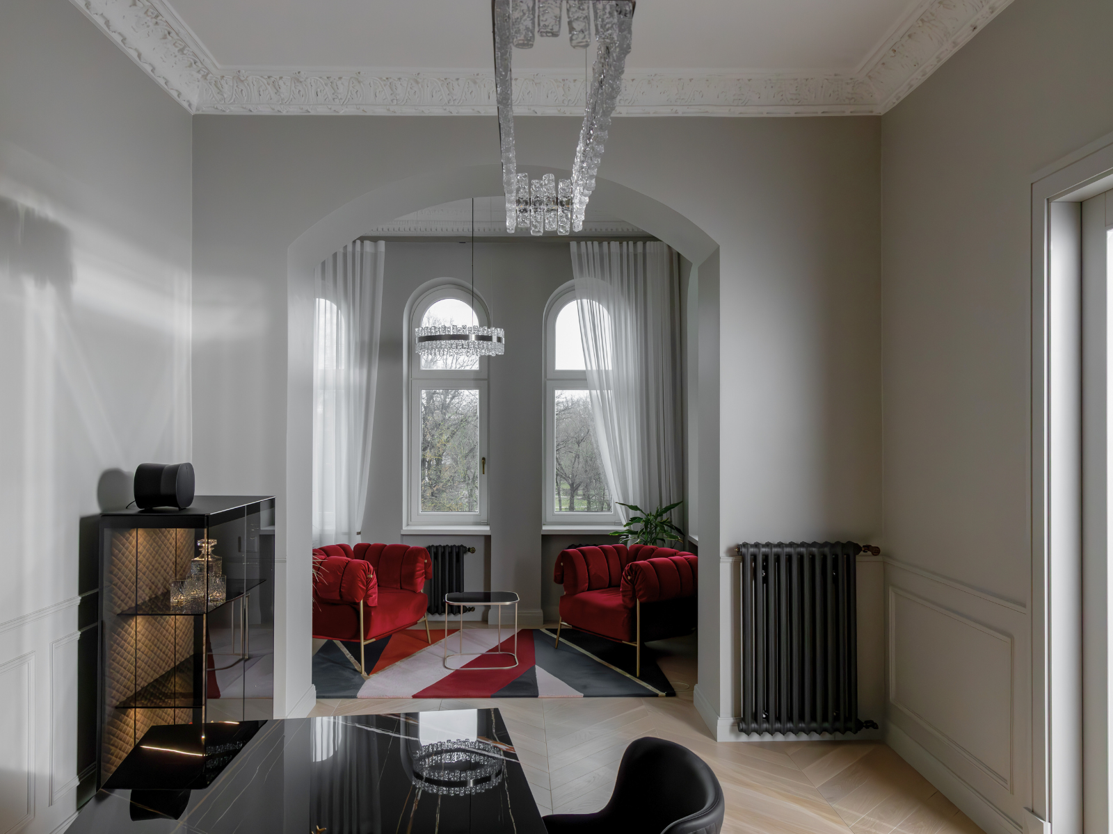 The conference room and the boss’s cabinet feature premium furniture and lighting from renowned brands Cattelan Italia and Bonaldo, combining elegance with functionality. The Atrium table, paired with Camilla chairs, provides a stylish and comfortable setting for productive discussions. In the lounge area, the Pacific sofa and matching armchairs by Ditre Italia serve as the centerpiece, offering a perfect blend of luxury and comfort. The space is elevated by the Prezioso chandelier by Italamp, which casts a warm, ambient glow, creating a refined and inspiring atmosphere for both work and relaxation.