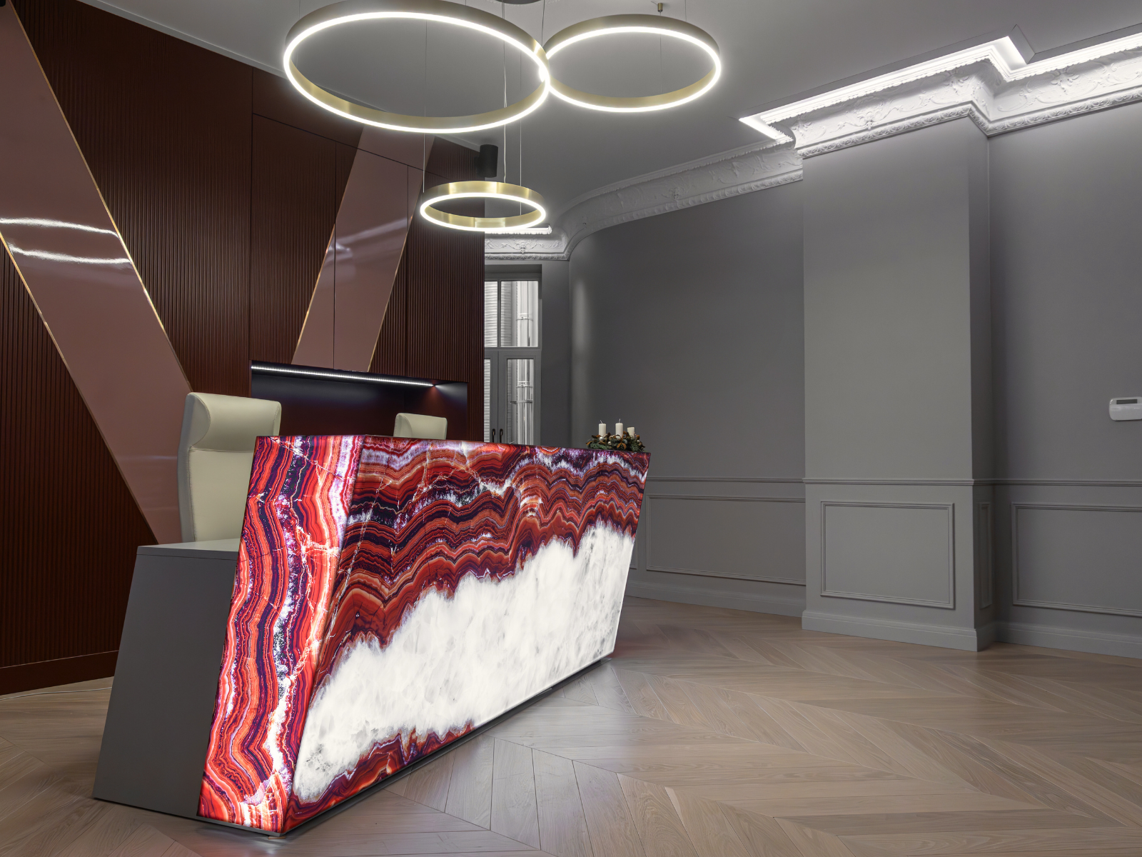 The client envisioned the entrance lobby as a space that would leave a lasting and powerful first impression on visitors. After extensive discussions exploring various design concepts, materials, and color palettes, the client chose a striking combination of features to achieve this goal. The centerpiece is a bespoke LED-lit counter made by Folio that adds a modern and dynamic touch to the space, perfectly complementing the overall aesthetic. Additionally, a custom-made wardrobe was designed to seamlessly blend functionality with elegance, ensuring the lobby is both visually appealing and practical.