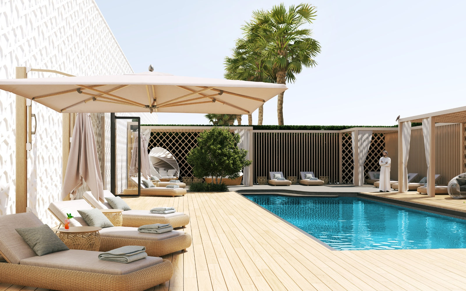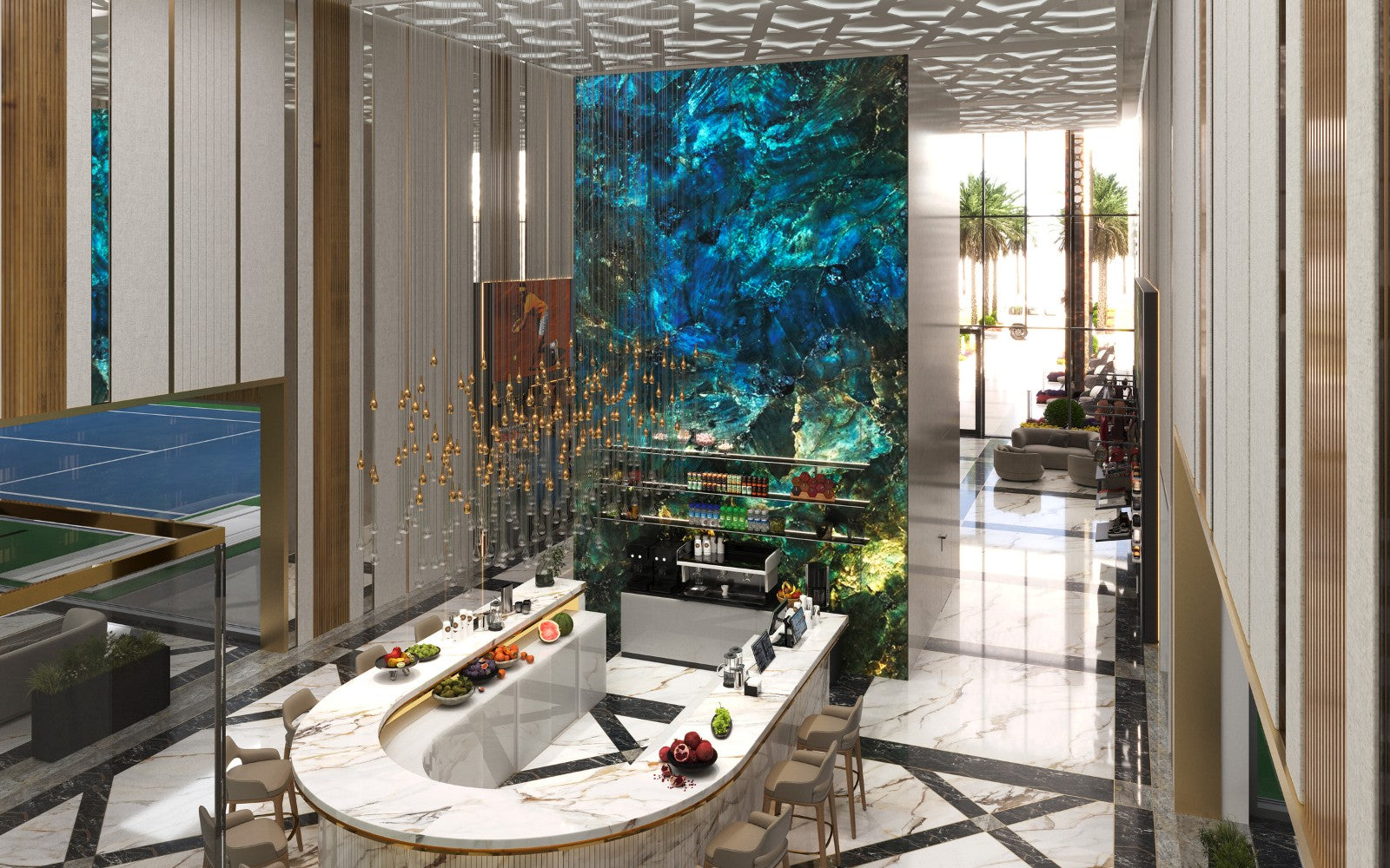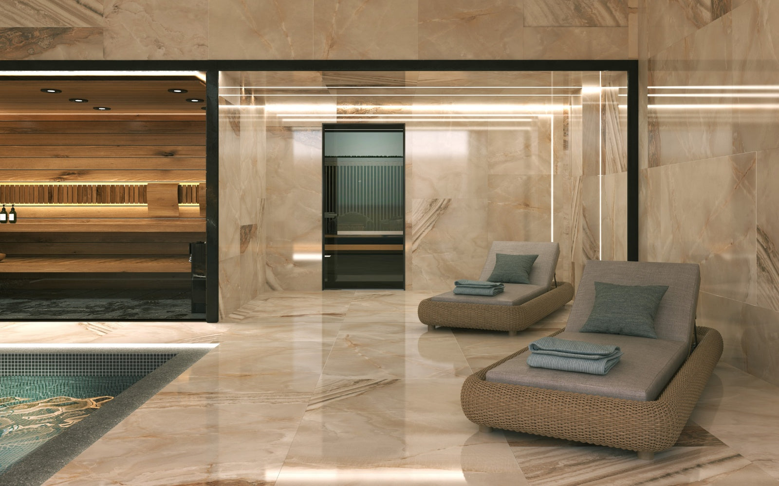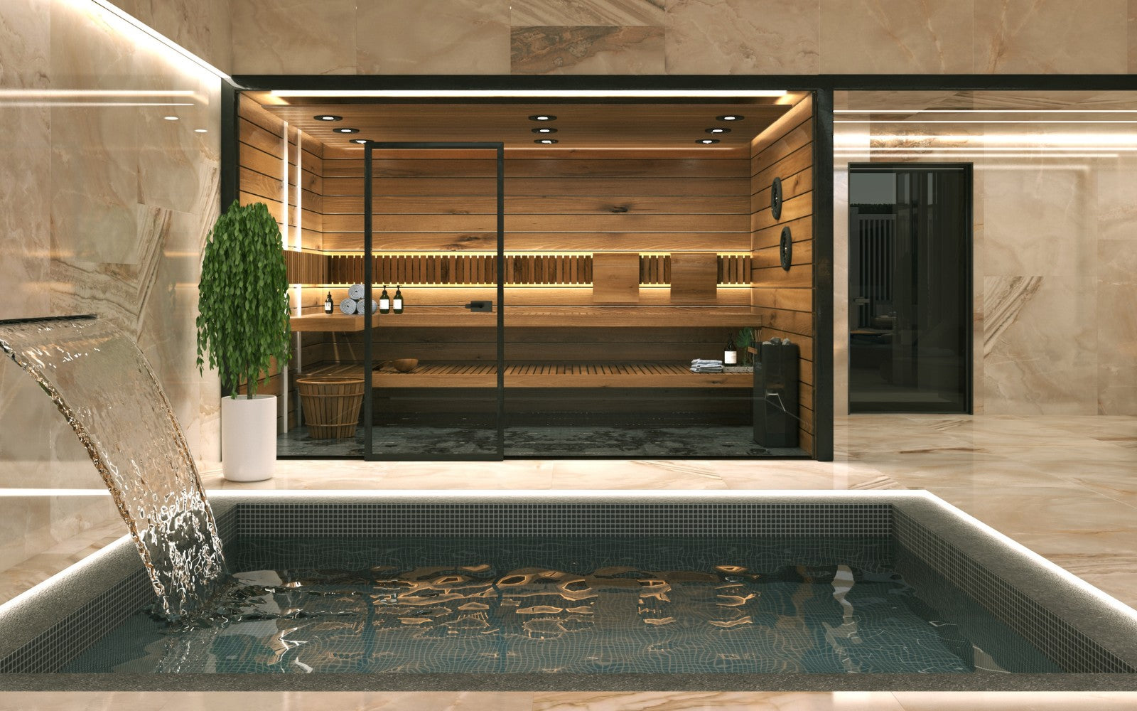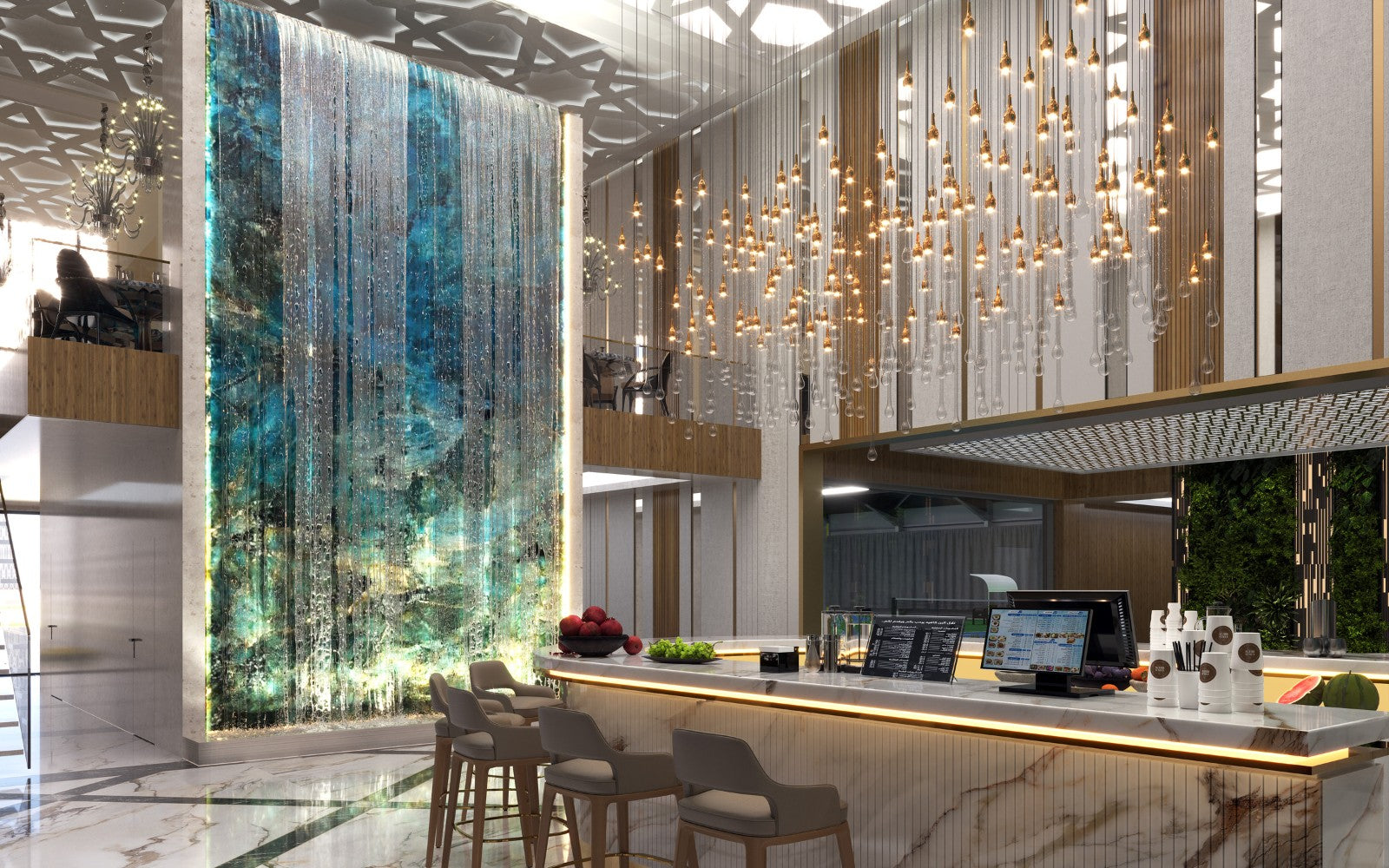 Apon entering the building, you are welcomed by soaring ceilings and elegant marble tiles that adorn the lobby, creating an immediate sense of grandeur and sophistication. As you move further into the facility, the central area features a stylish juice bar and lounge, offering a perfect spot to relax and rejuvenate. Beyond this, you will find the locker and massage rooms, thoughtfully designed to provide privacy and comfort. Additionally, the facility includes dedicated prayer rooms and luxurious indoor and outdoor spa areas, each separated for men and women.