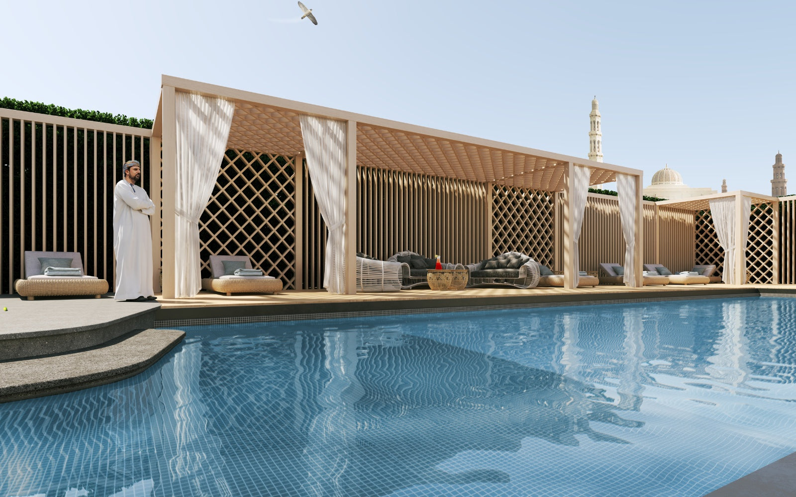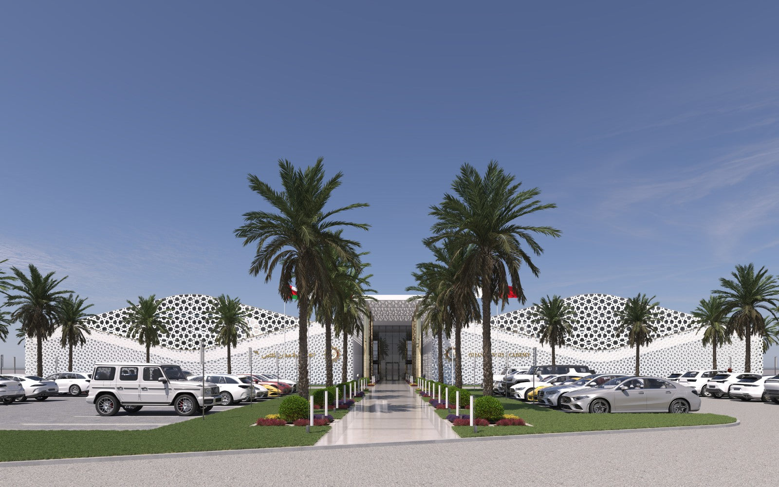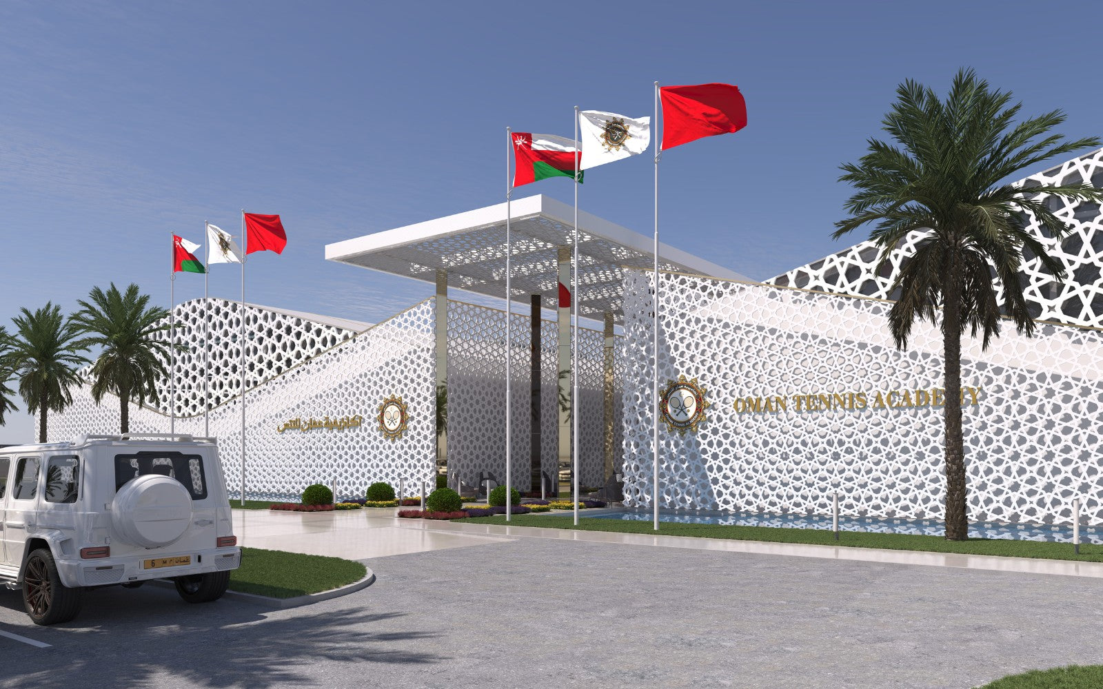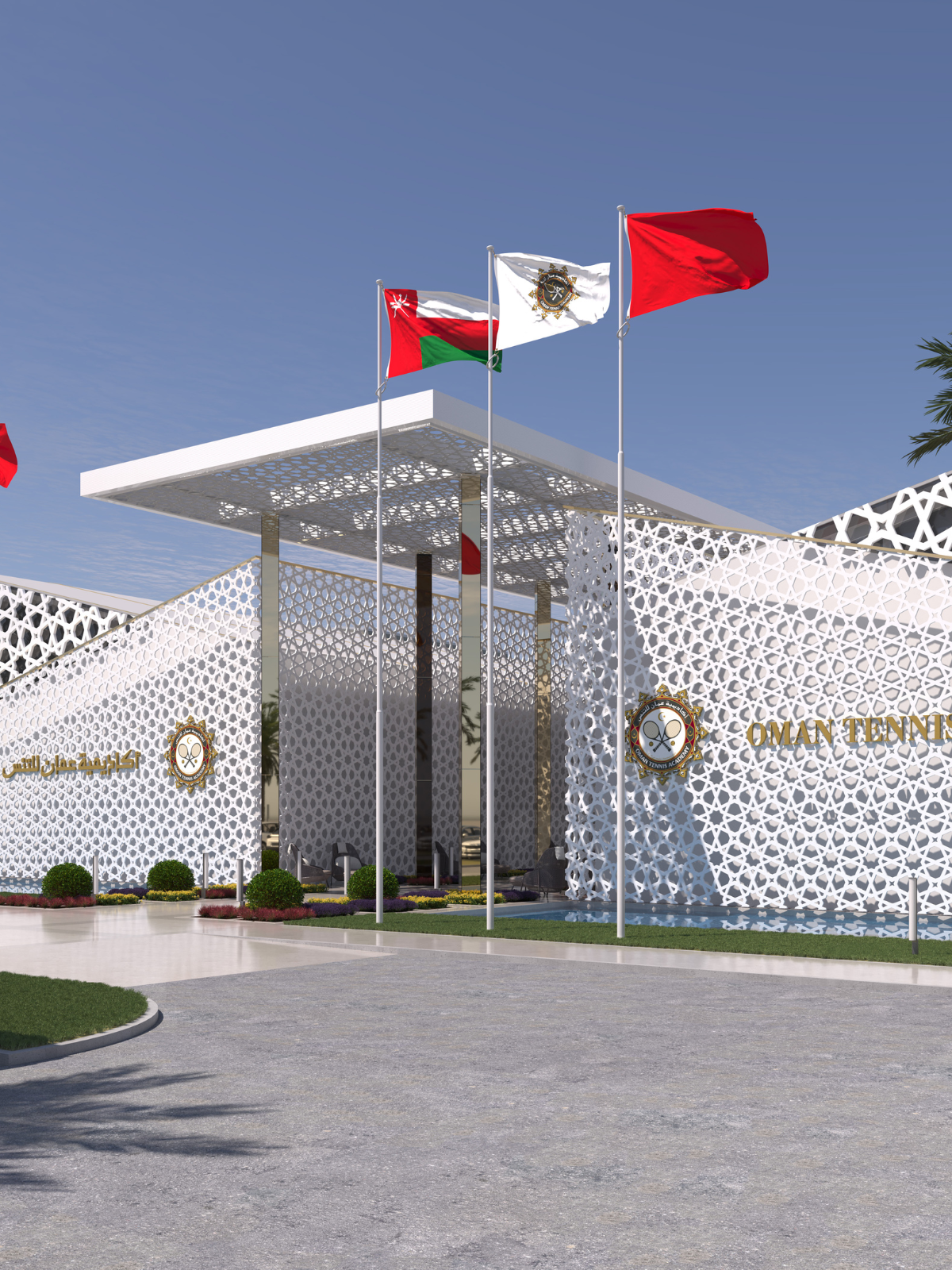 The Oman Tennis Academy stands as a beacon of modern architectural excellence, blending contemporary design with rich Omani cultural heritage. The exterior of the academy is a visual masterpiece, featuring an intricate lattice-patterned façade that seamlessly integrates traditional motifs with cutting-edge aesthetics. As you approach the building, the grand entrance captures your attention. A striking canopy, supported by sleek, modern columns, extends outward, offering a dramatic and inviting entryway. This area is beautifully landscaped with tall, graceful palm trees, which add a touch of natural elegance and frame the building perfectly.